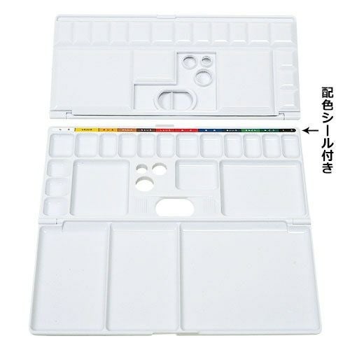 よく使う色(白、レモン、赤、青)のツボを大きく、絵の具を出しやすいように配色シールが貼られています。