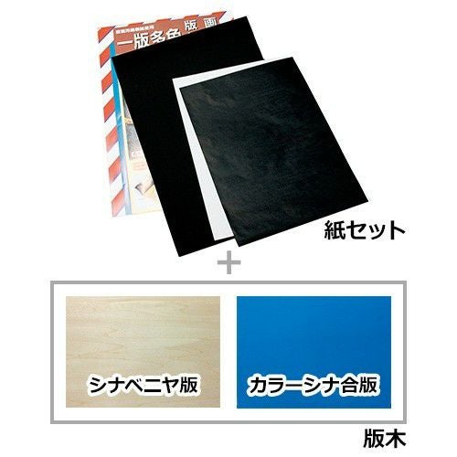 一版多色版画用のセットです。 カラーシナ合版は片面に彫り跡が見やすいように着色してあります。 紙セットと版木は別々になっています。